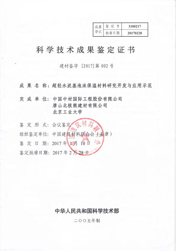 “超輕水泥基保溫材料”鑒定證書